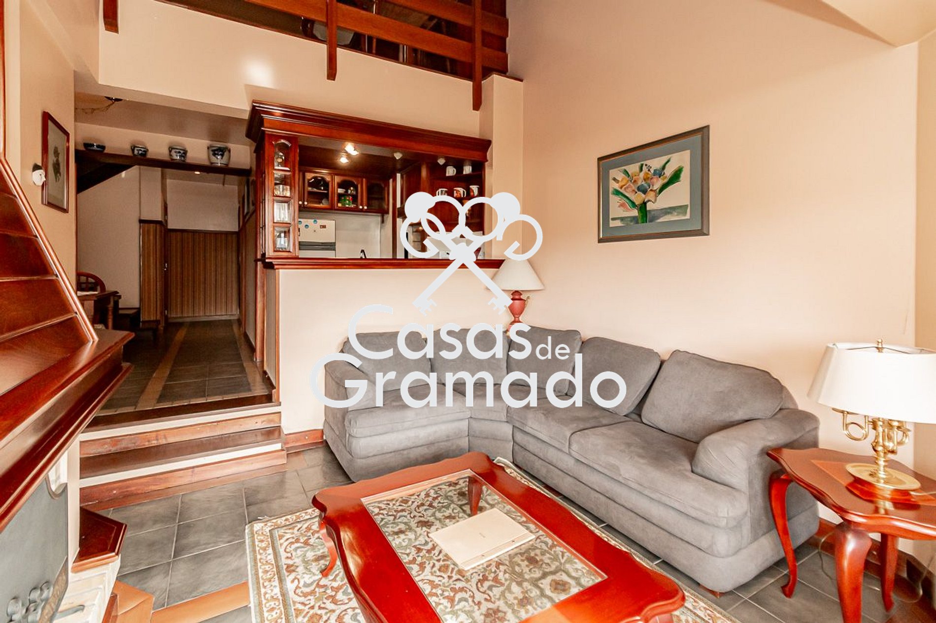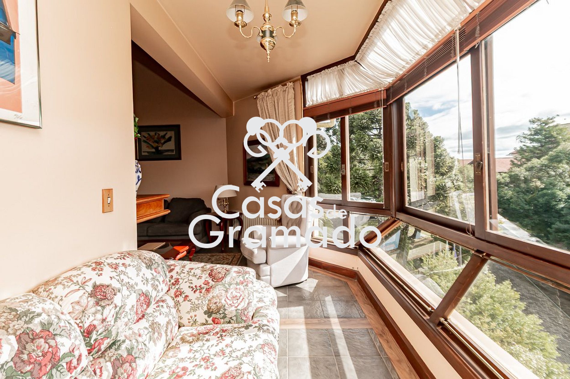 Um completo apartamento com 3 quartos, sala de estar, mezanino, varanda, dois banheiros, cozinha completa, elevador e garagem, além de uma linda vista para a cidade e as montanhas.