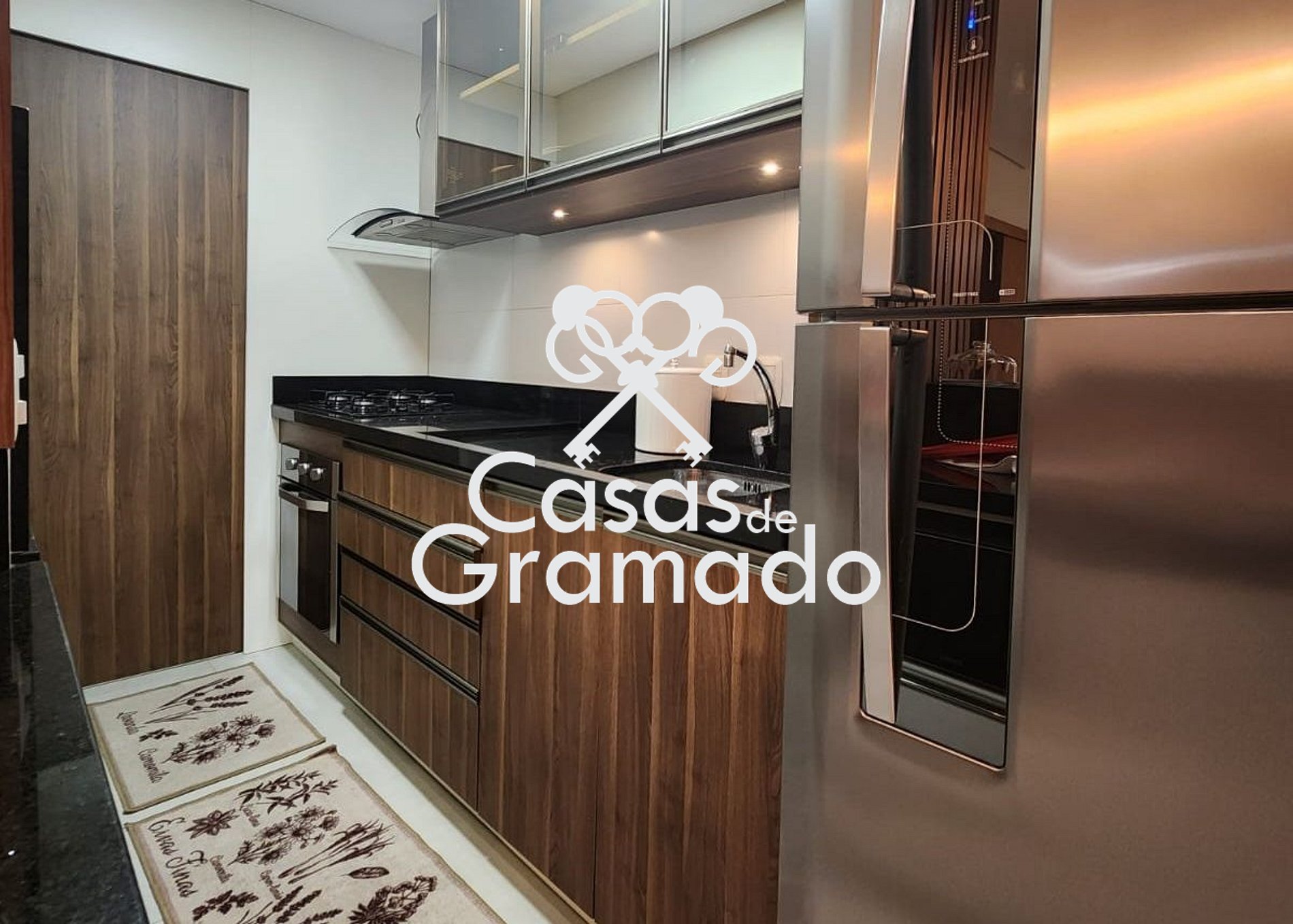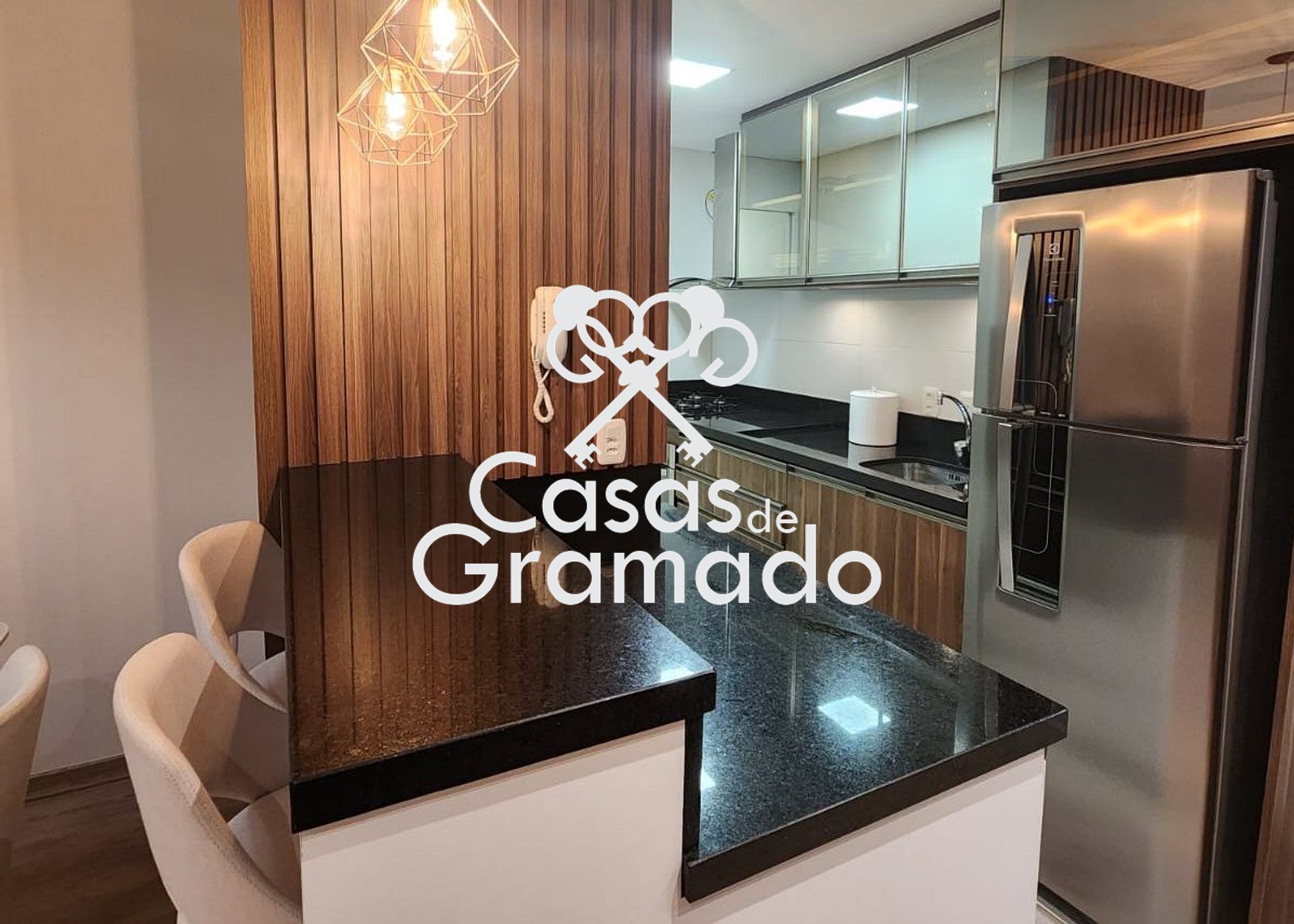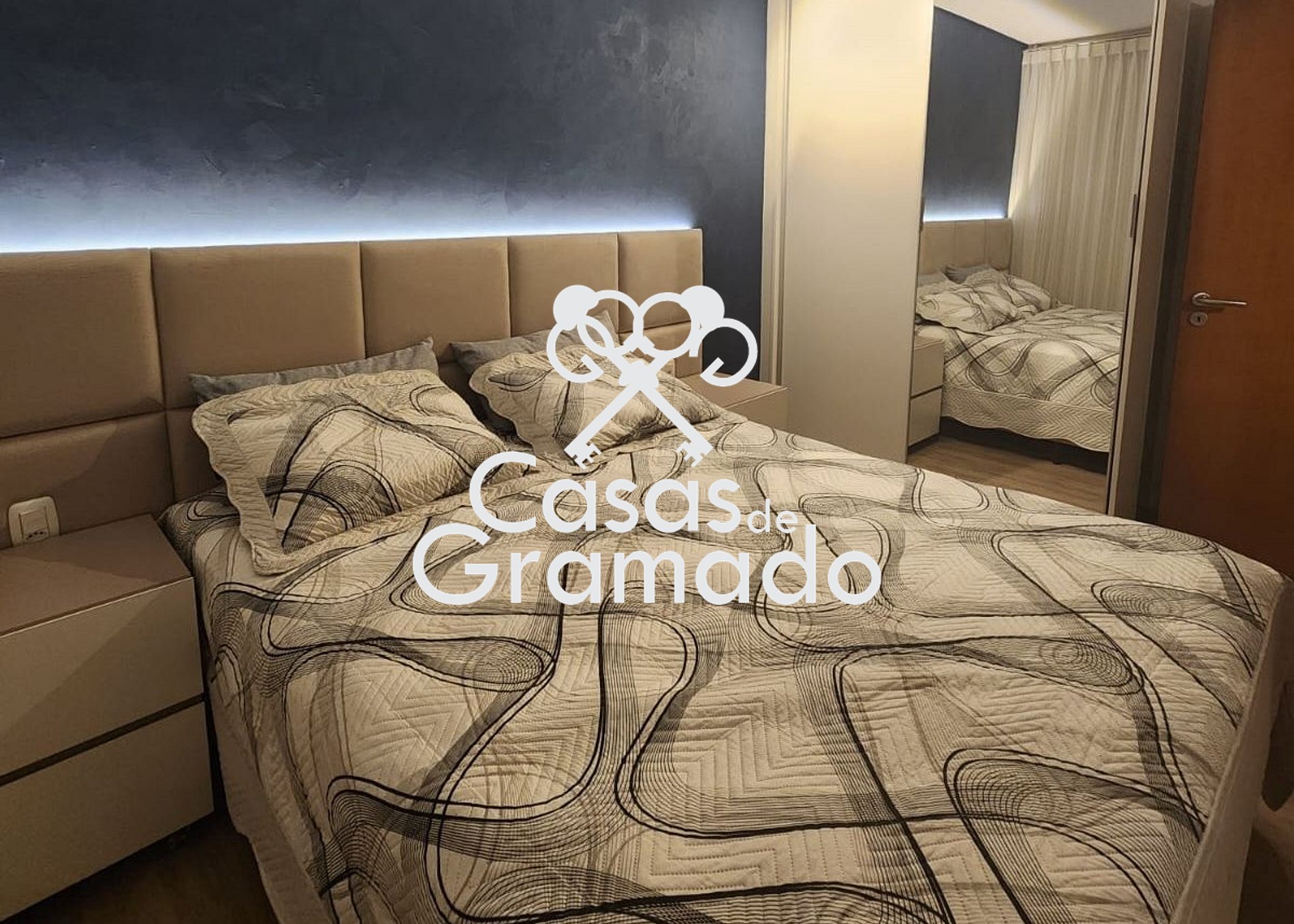 São dois quartos suítes e uma sala ampla com sofá cama. Todos itens de conforto inclusos, como wifi, garagem, churrasqueira, cozinha completa, piscina, play ground, sacada com uma vista linda, tudo novo e a 5 minutos do centro de Gramado.