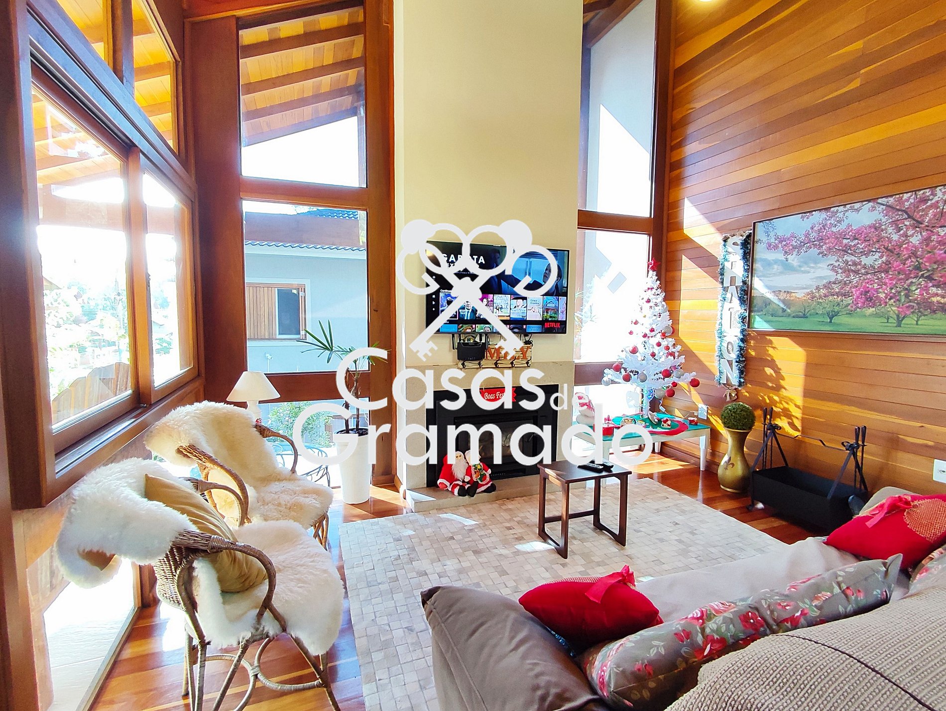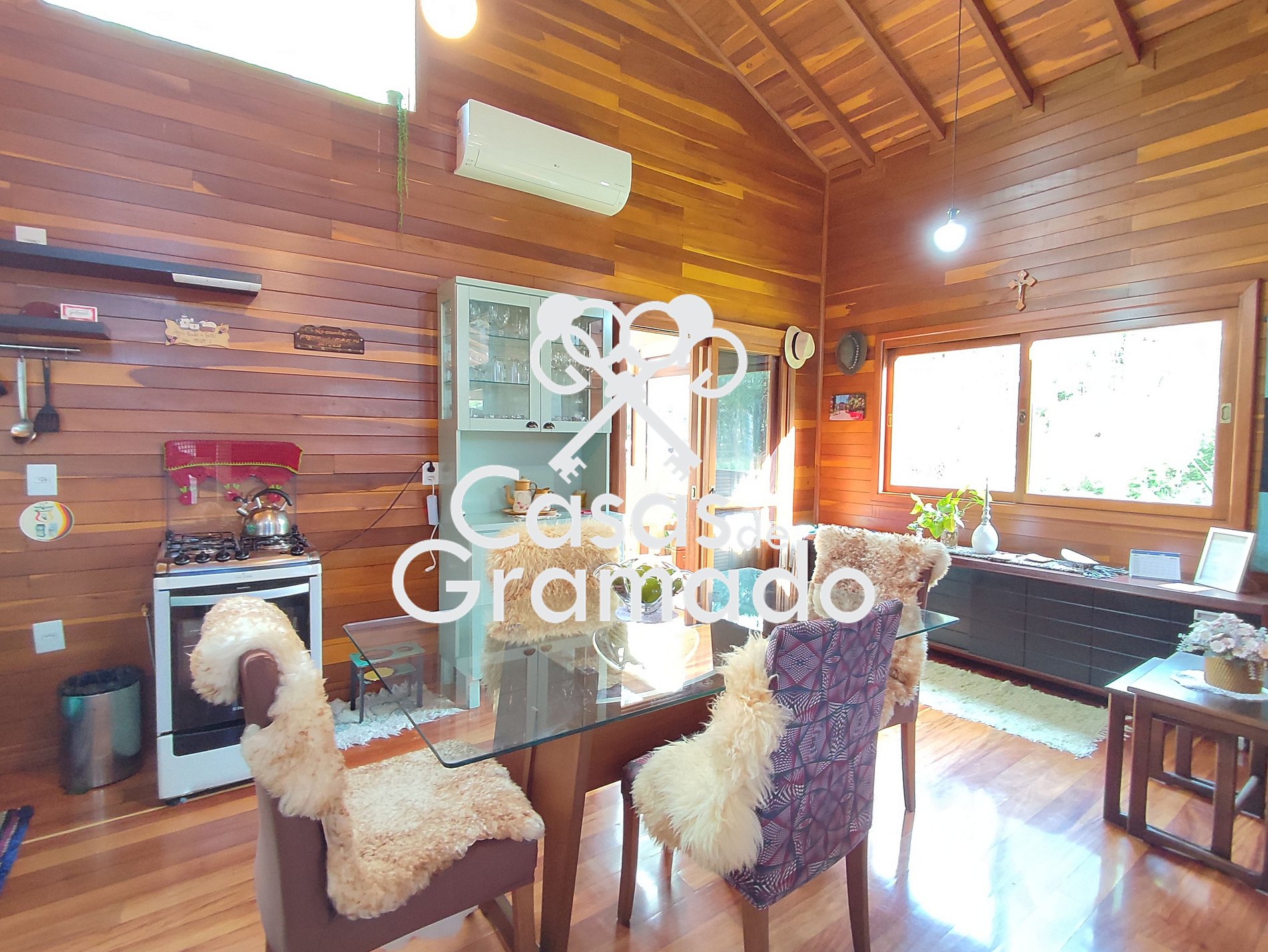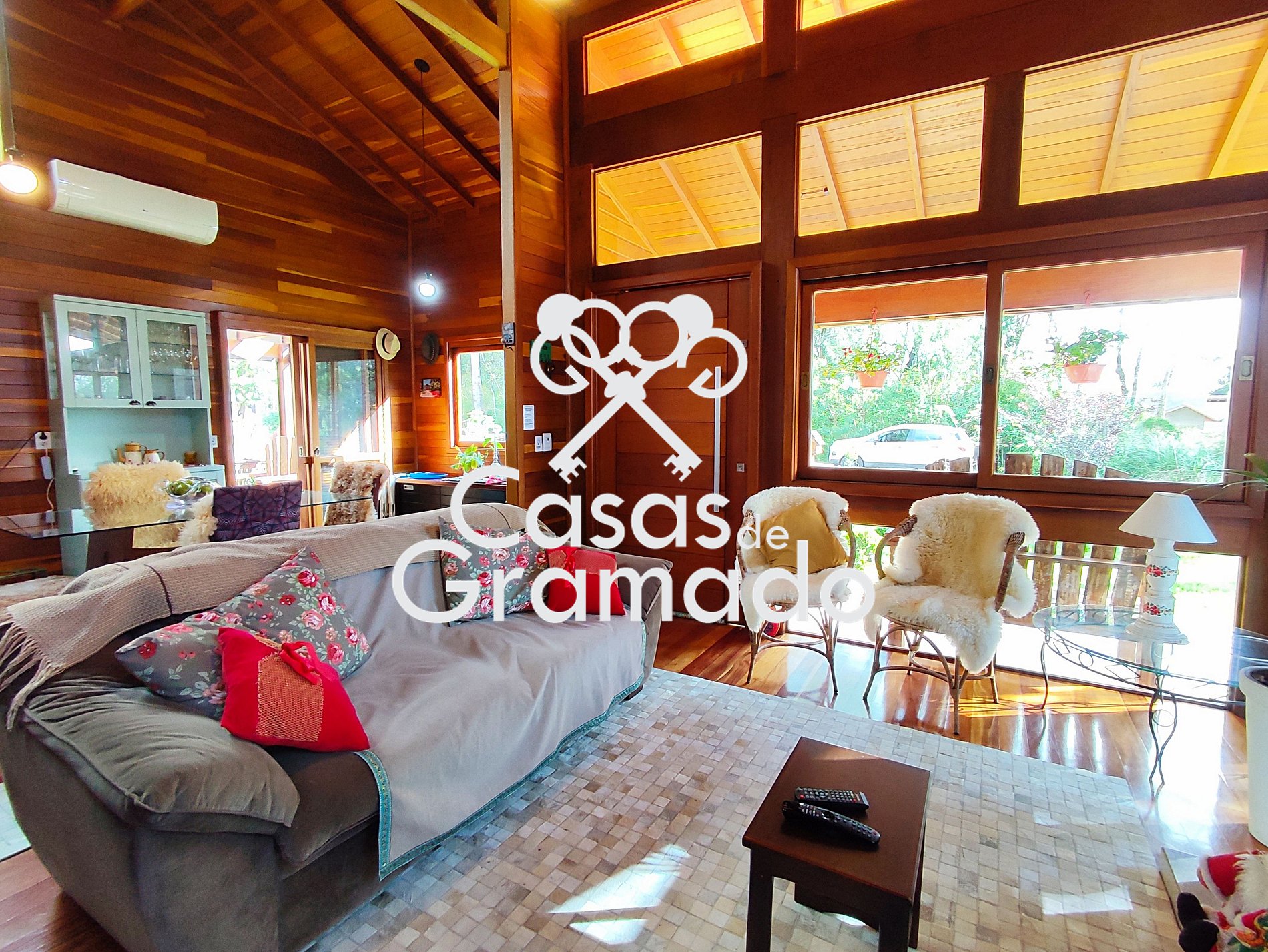 Possui 3 quartos e dois banheiros, wi fi, churrasqueira, solário, lareira, ar condicionado, cozinha completa e todas comodidades para uma temporada em alto estilo na Serra Gaúcha.