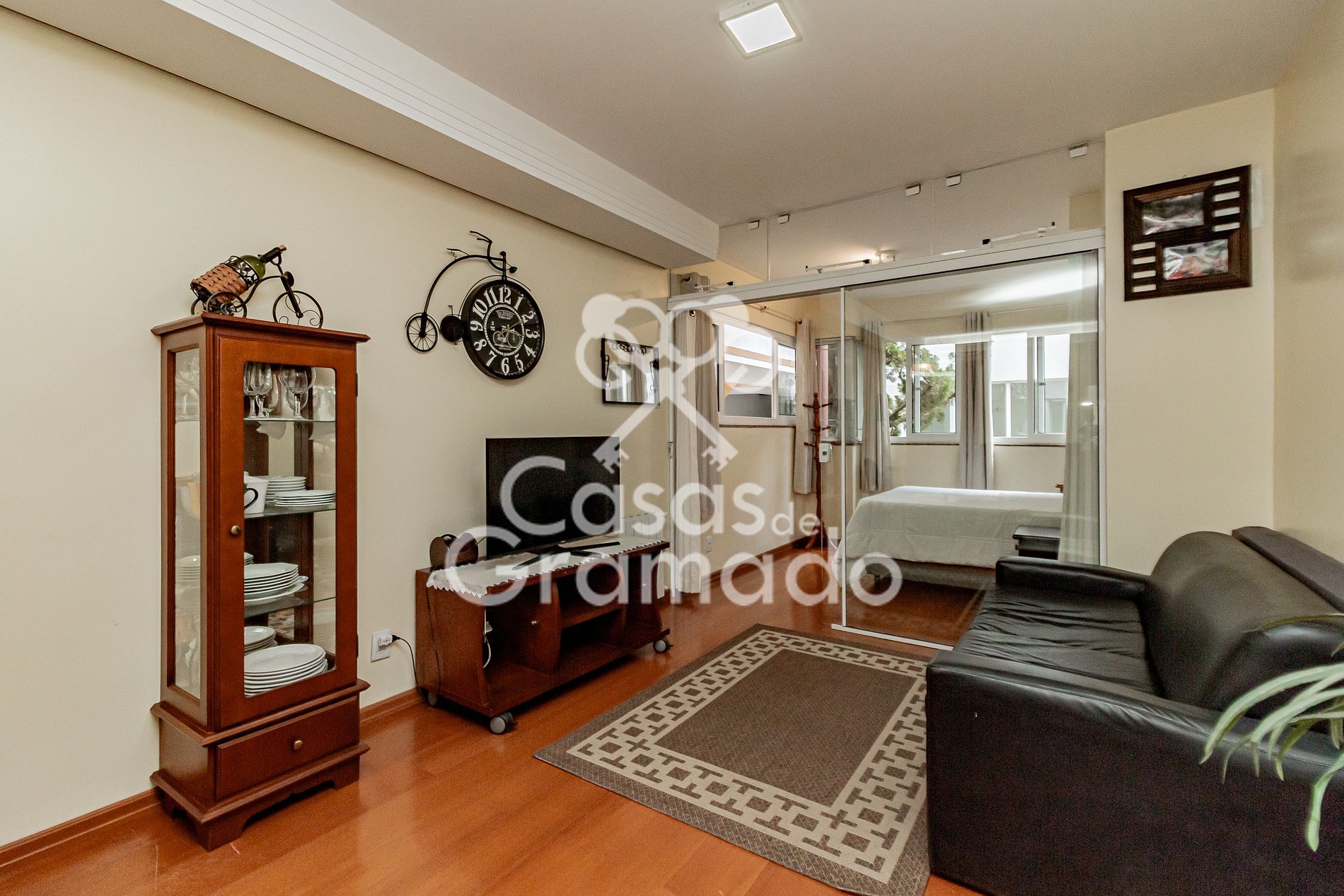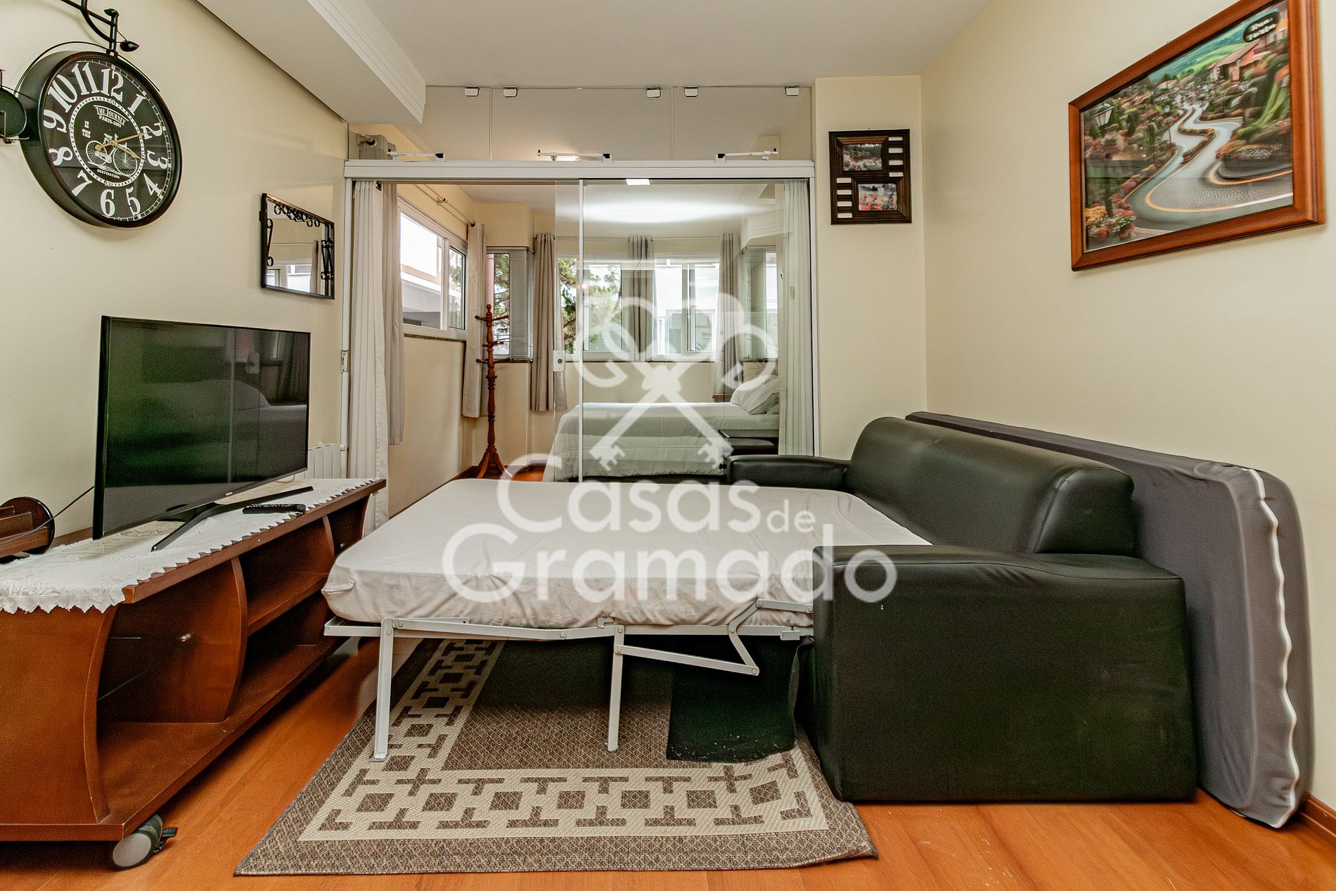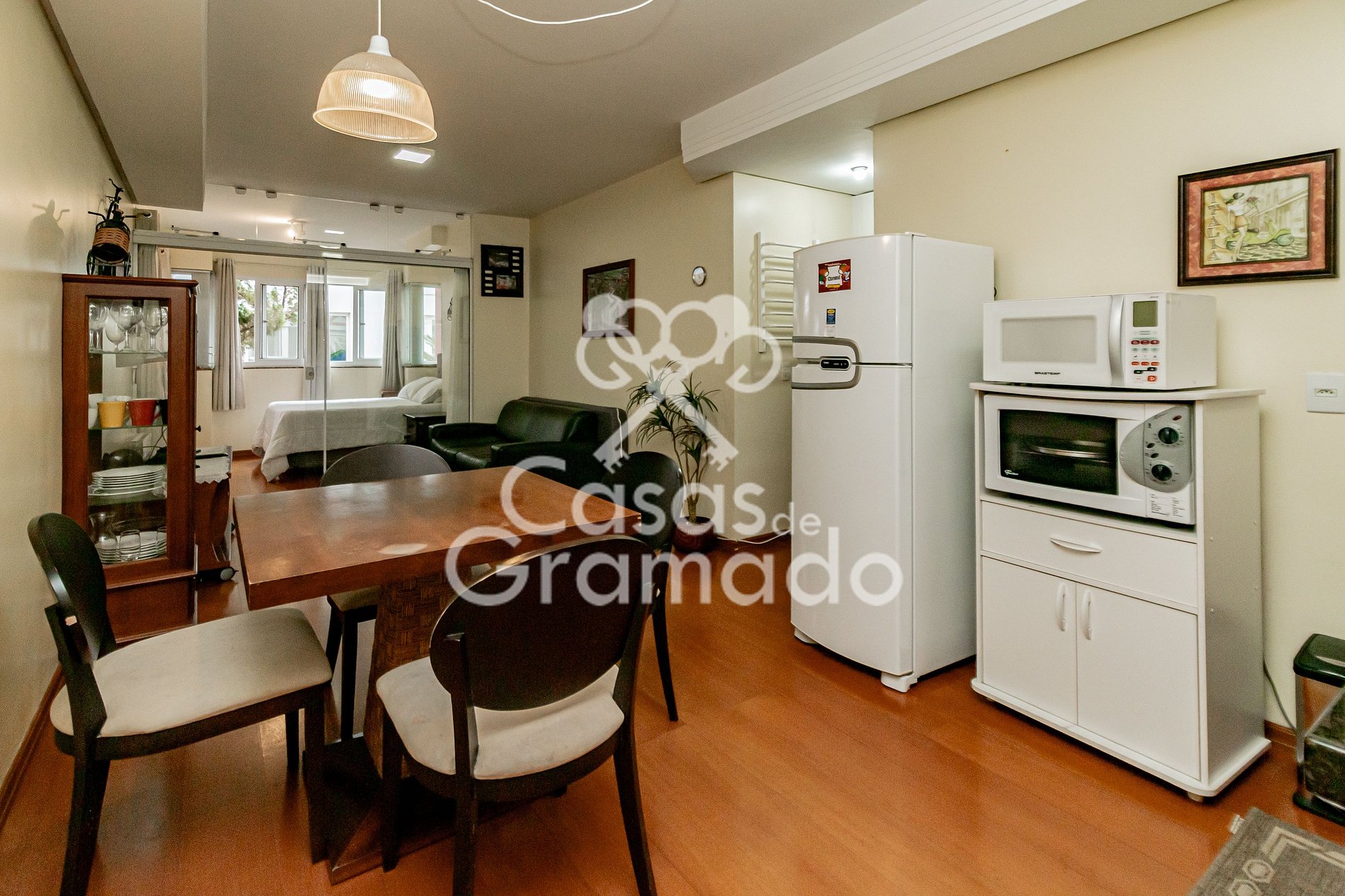 Possui sala de estar com divisória para quarto, cozinha compacta, banheiro, aquecimento e wifi.